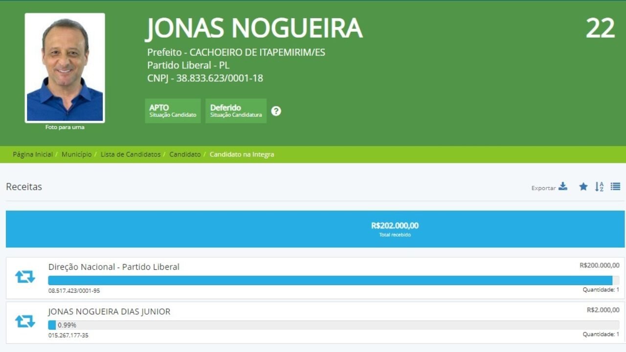Tudo isso tem um custo, obviamente. E a arrecadação e a despesa de cada um deles podem ser acompanhadas pelo site do Tribunal Regional Eleitoral do Espírito Santo. Em Cachoeiro de Itapemirim, até o momento, quem está com mais dinheiro para gastar é Jonas Nogueira (PL). Ele já declarou R$ 202 mil e, segundo consta no site, desses, R$ 200 mil são doações de partidos políticos.