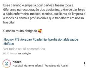 Em sua rede social, o HIFA (Hospital Infantil) que tem atuado na linha de frente de tratamento a covid-19, agradeceu e reconheceu a importância de manter a fé neste momento dificil para os pacientes e familiares.