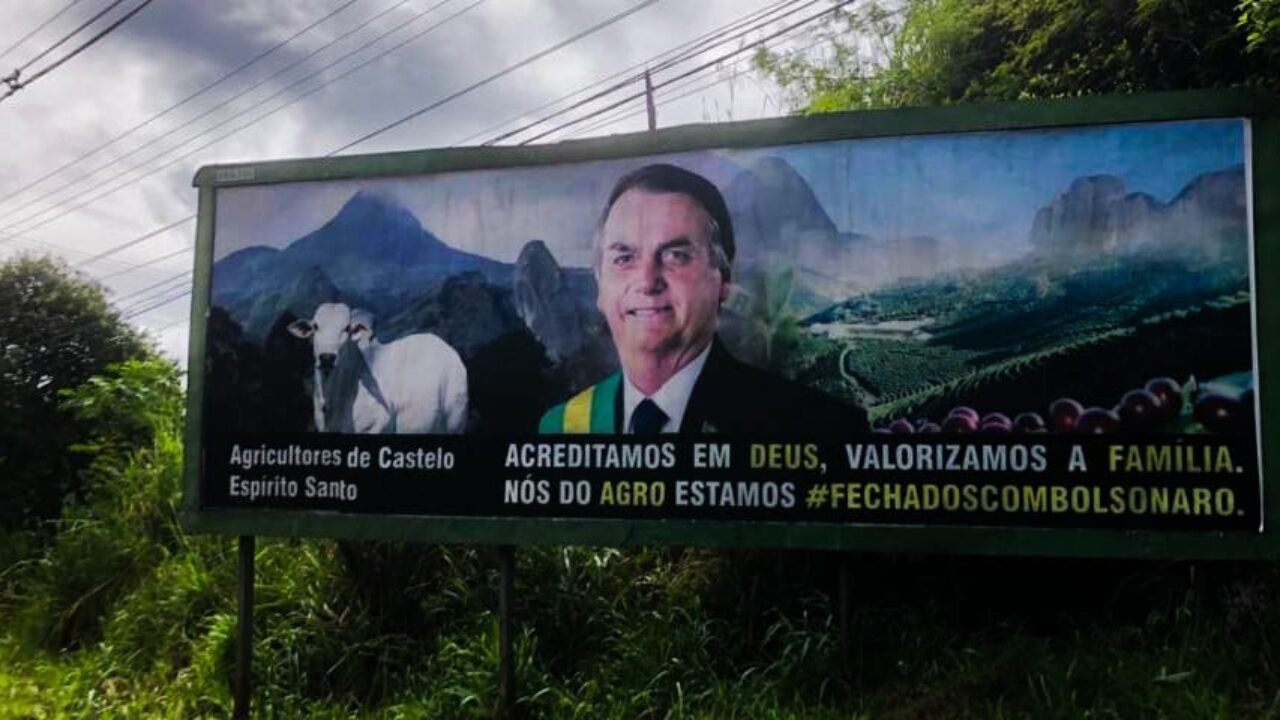 Um outdoor na rodovia que dá acesso ao município de Castelo, no sul do Espírito Santo, assinado como “agricultores” manifesta apoio ao presidente Jair Bolsonaro. “Acreditamos em Deus, valorizamos a família. Nós do Agro estamos #fechadocombolsonaro”, diz o outdoor que está gerando diversos “memes” na rede social. Confira: