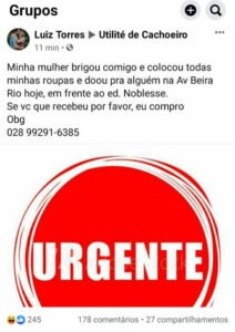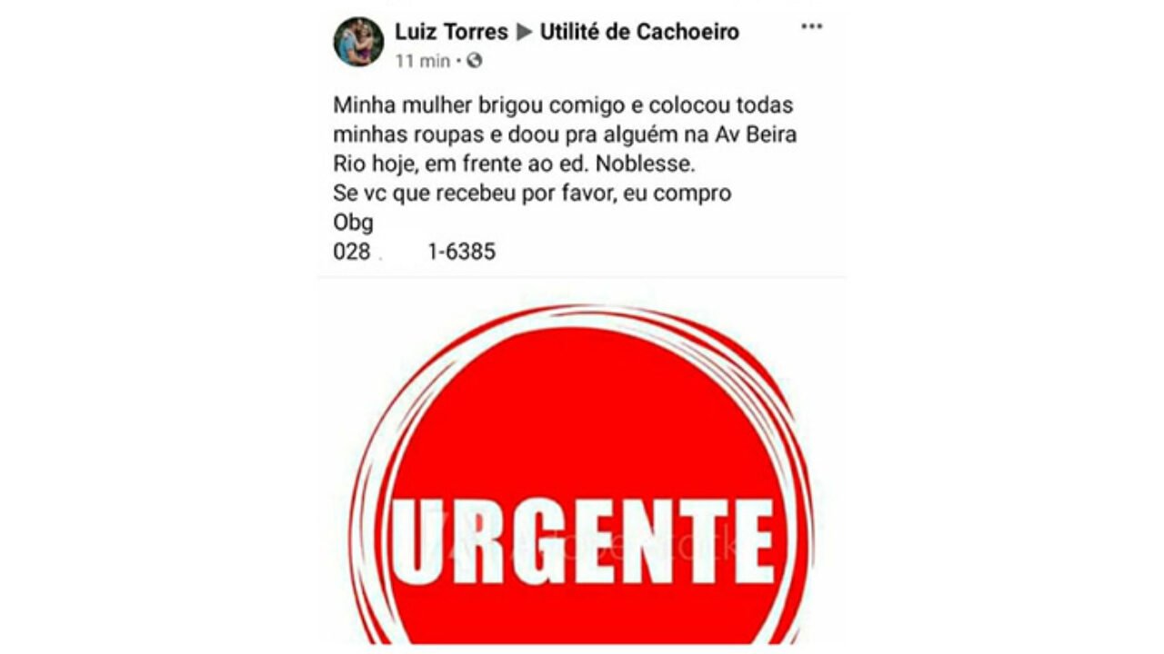 Uma postagem curiosa viralizou na rede social em Cachoeiro de Itapemirim-ES. Um homem, com perfil identificado como Luiz Torres, buscava recuperar suas roupas na rede social, que, segundo ele, foram doadas por sua mulher, após briga de casal.