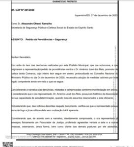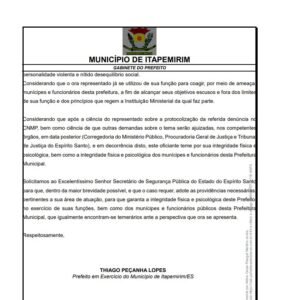 O prefeito de Itapemirim, Thiago Peçanha, enviou ao secretário estadual de Segurança Pública do Espírito Santo, Alexandre Ofranti Ramalho, um pedido de providências, no sentido de garantir a sua segurança, por estar se sentindo ameaçado pelo promotor de justiça da comarca do município.