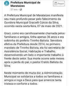 A Prefeitura Municipal de Marataízes, lamentou na tarde desta sexta-feira (7), a morte da servidora pública Gracielli Cúrcio da Silva, de apenas 36 anos.