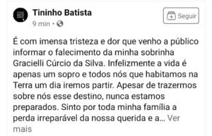 Gracielli era servidora efetiva do municipio e sobrinha do prefeito Tininho Batista. Há cerca de sete meses atrás, faleceu também o pai da jovem, Eraldo Batista da Silva.