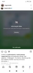 Nos dois casos, o conteúdo dos vídeos contém informações falsas, segundo o Instagram e, por isso, não foram ao ar. Essas proibições de conteúdos feitas pelo Instagram visam combater as fake News e evitar que mentiras sejam disseminadas, desencorajamento, por exemplo, as pessoas a se imunizarem contra o coronavíurs, sob argumentos irreais.