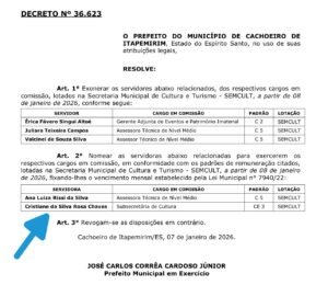 O vice-prefeito de Cachoeiro, Juninho da Cofril, que ocupa a função de prefeito enquanto Ferraço está de licença, nomeou sua tia Cristiane da Silva Rosa Chaves, como subsecretária de Cultura.