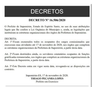 O prefeito reeleito de Itapemirim, no litoral Sul do Espírito Santo, Thiago Peçanha, exonerou todos os cargos comissionados hoje. A decisão foi publicada no Diário Oficial do Município, com o decreto número 16.506/2020.