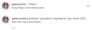 Ao lado dos amigos, Peter Costa publicou em suas redes sociais duas fotos com a seguinte legenda: “Agradecer, agradecer e agradecer, que venha 2022, feliz ano novo pra todos!”, com a localização em Acqua Plage Jurerê Internacional.