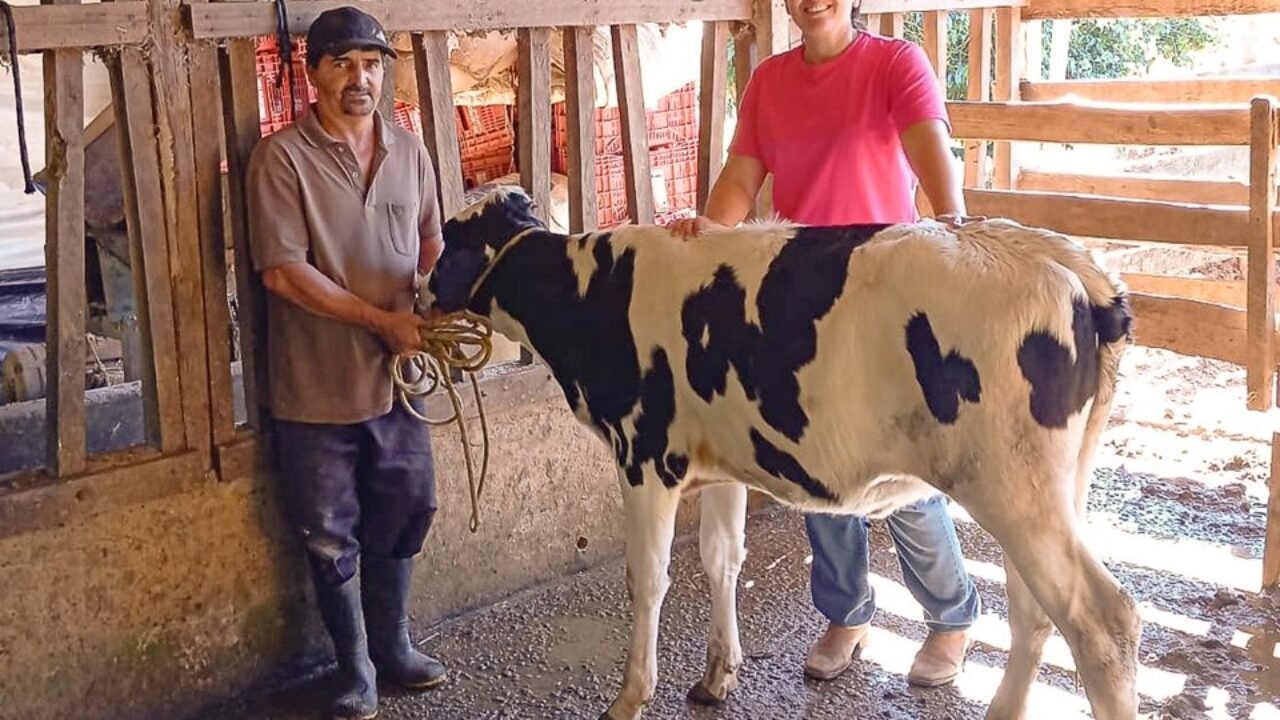 Na região do Caparaó, município de Guaçuí, o produtor Rogério Peixoto celebra os nove meses de duas bezerras. Ele conta com a assistência da extensionista Lorena Ribeiro, que o orienta sobre as práticas de manejo adequadas a animais nessa fase.