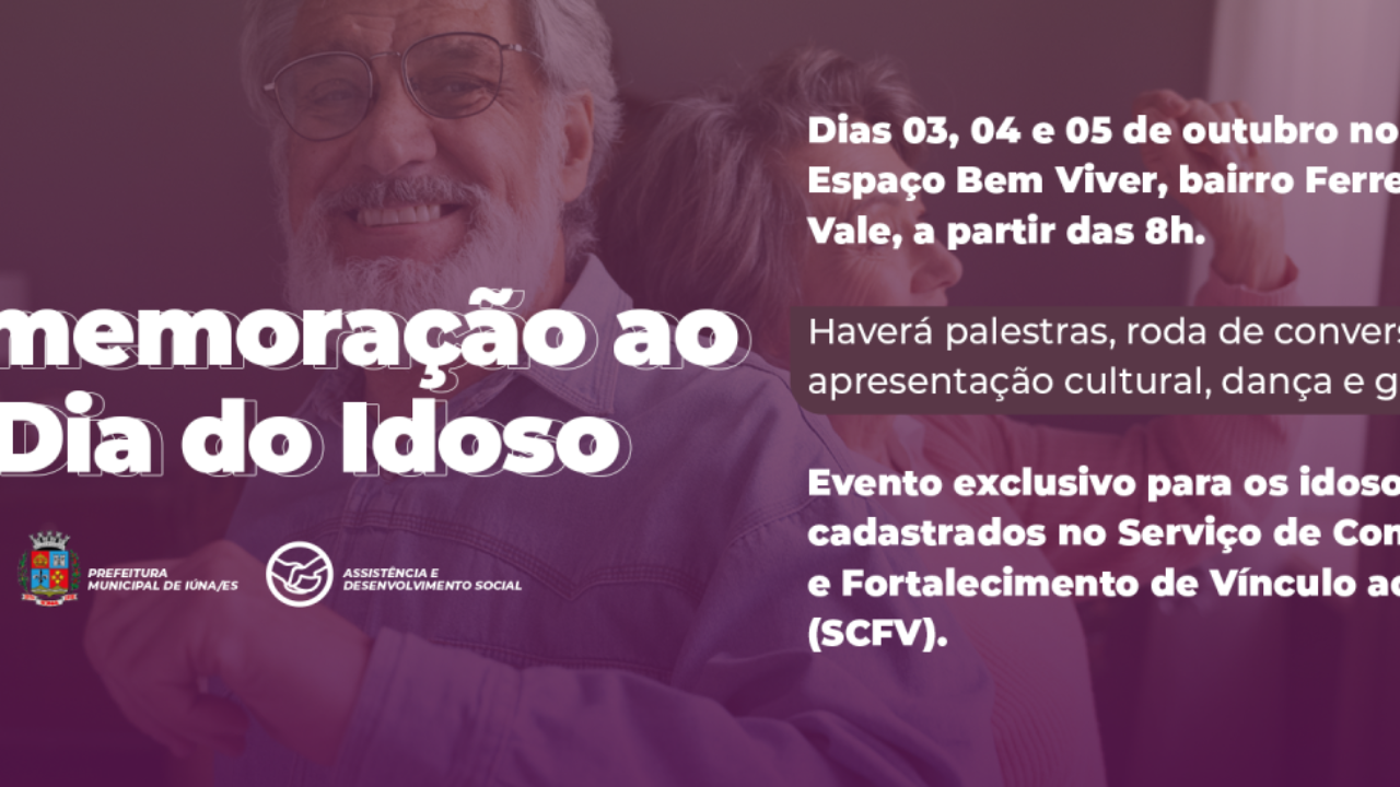 Em comemoração ao Dia do Idoso, em 01 de outubro, a Prefeitura de Iúna, através da Secretaria de Assistência e Desenvolvimento Social, fará três dias de atividades com os idosos cadastrados no Serviço de Convivência e Fortalecimento de Vínculo ao Idoso (SCFV).