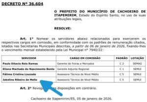 A tia do vereador Lucas Genro do Silvinho (PL), Jaqueline Ribeiro de Melo, foi nomeada para exercer o cargo comissionado de Assessor Técnico de Nível Médio na Secretaria Municipal de Interior da prefeitura de Cachoeiro.
